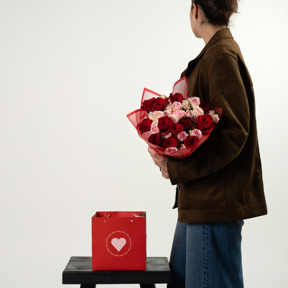 A hand bouquet containing red and pink roses, arranged beautifully.