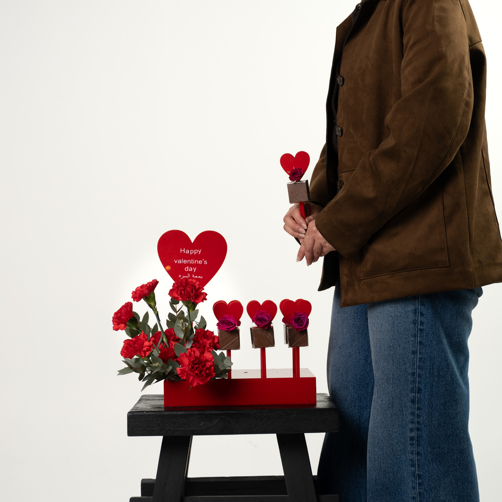 A box featuring carnations with 12 heart sticks of Belgian chocolates.