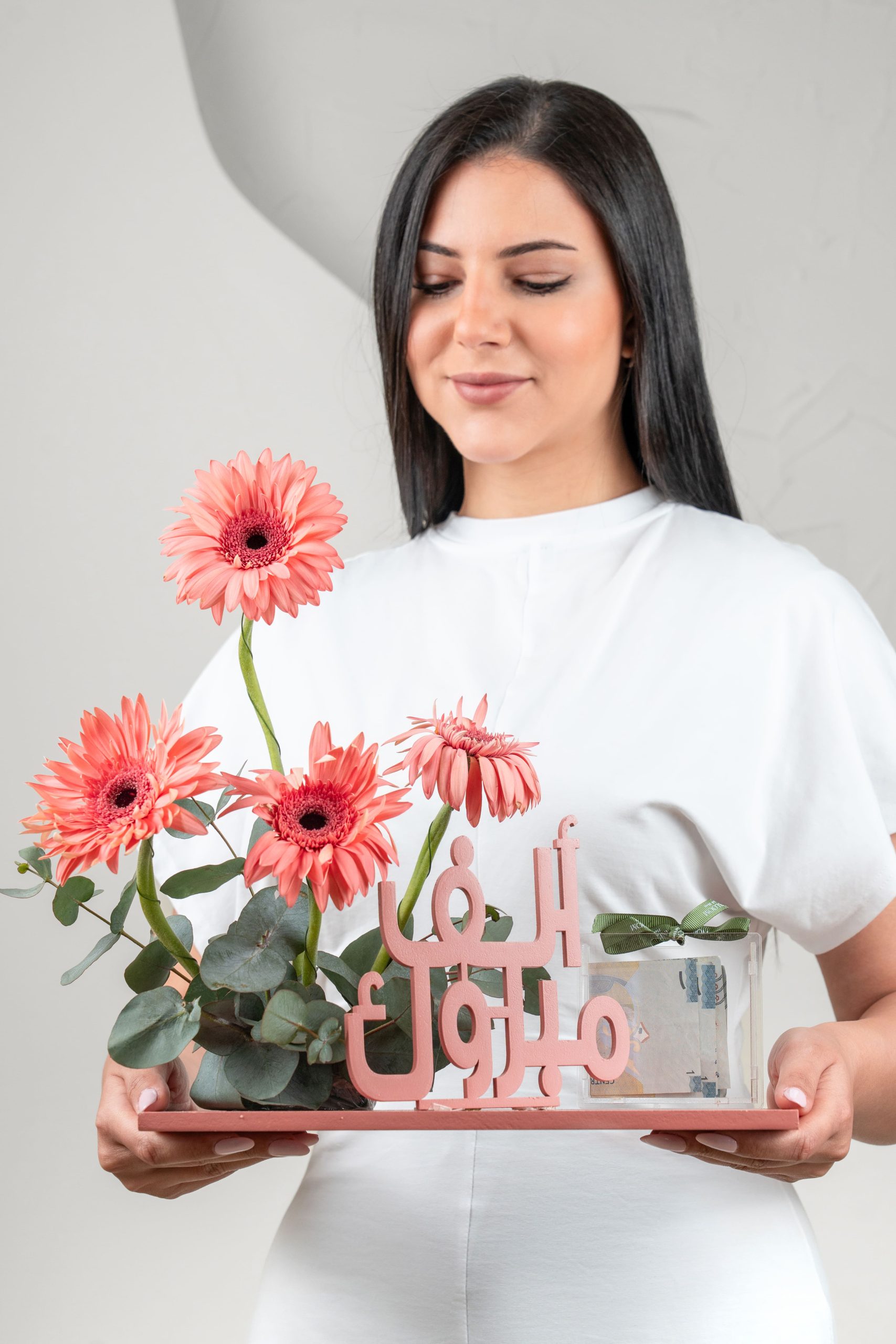 Flowers used : peach gerbera , eyclptus
